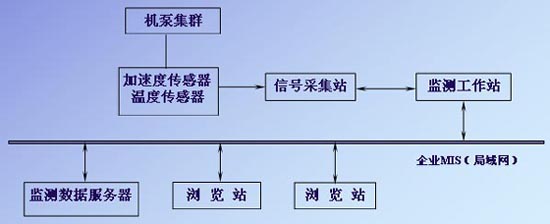 系統(tǒng)是一種分布式網(wǎng)絡(luò)型遠(yuǎn)程數(shù)據(jù)采集分析系統(tǒng)。其中,現(xiàn)場信號采集站安裝在現(xiàn)場,每個現(xiàn)場信號采集站負(fù)責(zé)采集多臺機泵的振動和溫度信號?,F(xiàn)場信號采集站與監(jiān)測工作站之間采用網(wǎng)絡(luò)形式通訊,采用TCP/IP通信協(xié)議,可以遠(yuǎn)距離通暢傳輸數(shù)據(jù)。系統(tǒng)現(xiàn)場信號采集站數(shù)量不限,數(shù)據(jù)傳輸速率最高可達(dá)10M/100MBbps,用來傳輸系統(tǒng)設(shè)置信息、測量信號數(shù)據(jù)、波形、信號報警信息等。監(jiān)測工作站可以通過企業(yè)MIS網(wǎng),實現(xiàn)機泵運行數(shù)據(jù)的網(wǎng)上共享,相關(guān)部門和人員都可以使用網(wǎng)絡(luò)瀏覽器觀察現(xiàn)場機泵的運行數(shù)據(jù)。