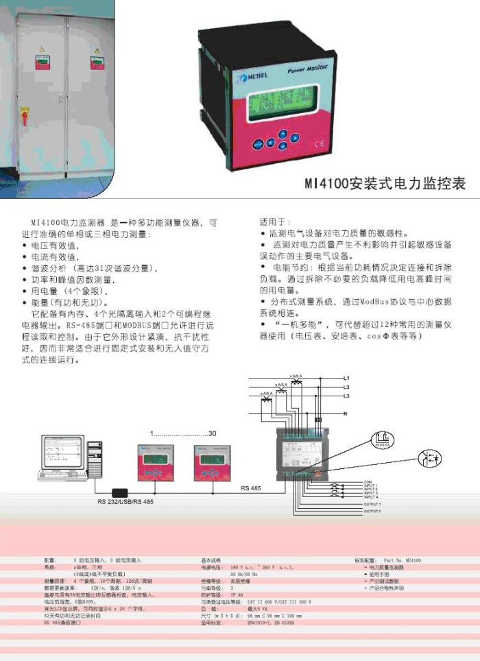 - 關(guān)鍵參數(shù):MI4100 電力監(jiān)控儀表是一種多功能測量儀器,可進(jìn)行準(zhǔn)確的單相或三相電力測量: 配置:3組電壓輸入,3組電流輸入。 42 天有功和無功記錄時間,系統(tǒng):s單相,三相(3線或4線不平衡負(fù)載),RS 485 通信端口