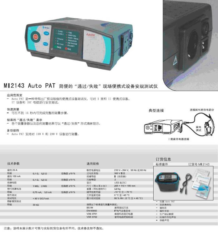 - 關(guān)鍵參數(shù):MI2143現(xiàn)場便攜式設(shè)備安規(guī)測試儀,應(yīng)用范圍寬,可對I類和II便攜式設(shè)備、IT設(shè)備和IEC電纜進(jìn)行安全測試??稍诓坏?15 秒內(nèi)可完成完整的測量步驟,各個(gè)測量參數(shù)以及總的測量結(jié)果可以“通過 / 失敗”形式清晰顯示。支持對 110 V 和 230 V 設(shè)備進(jìn)行測量。