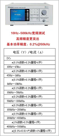 PF4000功率分析儀可解決10Hz~500kHz電信號(hào)的精確測量,采用DSP高速采樣、低失真寬帶取樣、信號(hào)實(shí)時(shí)分析、PLL鎖相環(huán)同步,線性濾波,過零濾波等國際先進(jìn)技術(shù),保證各種非周期波及高頻信號(hào)的精確測量,大屏幕液晶顯示所有測試數(shù)據(jù)與波形,無需電腦即可獨(dú)立工作。10Hz~500kHz寬頻測試,高頻精度更突出,功率基本精度為0.2%@50kHz。