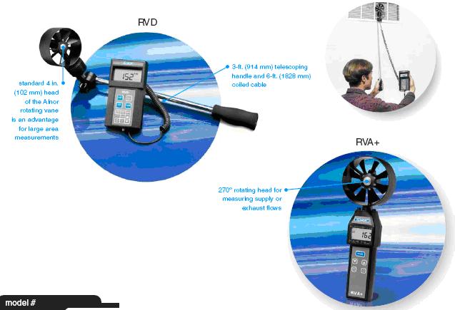 旋轉(zhuǎn)葉片風(fēng)速計可測量真實空氣速度,讀物無需進(jìn)行密度校正因子修正。 RVA+ 的用戶可通過按單側(cè)按鈕并對被測量區(qū)域進(jìn)行“掃描”而獲得面積平均流量。 RVD 提供了伸長測量以及數(shù)據(jù)記錄、調(diào)用和下載功能。