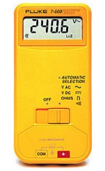 7-600 多用表可安全、自動(dòng)地測量交流電壓、直流電壓、電阻和通斷性。使用簡單,是真正的“傻瓜表”。7-600“傻瓜表”的自動(dòng)選擇功能使電力環(huán)境下的電壓測試變得非常簡單。在測量歐姆/通斷性時(shí),如果輸入插孔上的電壓高于4.5V(有意或無意),多用表則會(huì)自動(dòng)切換至交流或直流電壓測量功能,這取決于是交流電壓大還時(shí)直流電壓大。其輸入阻抗大約為2k歐姆,可以幫助用戶判斷電壓是來自漏泄還是硬連接。在所有測量模式下都提供過載保護(hù)。