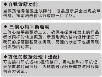 ●箱門丹啟時(shí),微風(fēng)循環(huán)、加熱和搖床自動(dòng)停止,無(wú)溫度過沖之弊。