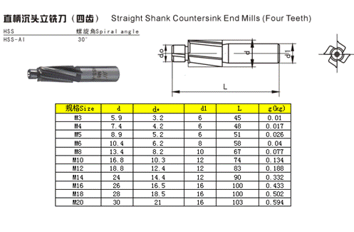 - 儀器名稱:直柄沉頭立銑刀(四齒)