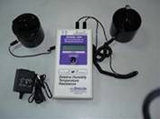 二、表面電阻測(cè)量(點(diǎn)對(duì)點(diǎn)) (Surface Resistance Measurement (RTT)) 這個(gè)測(cè)量方法是符合EOS/ESD-S4.1測(cè)量要求來測(cè)量獨(dú)立于接地的兩點(diǎn)之間的電阻,用這個(gè)測(cè)量方法得出的測(cè)量結(jié)果與被測(cè)物體的處理、兩個(gè)5磅探頭之間的距離等因素有關(guān),因此,應(yīng)選擇正確的測(cè)量規(guī)程,每次在同樣要求的測(cè)量條件下進(jìn)行測(cè)試。 A、將連線插頭插入表的兩個(gè)3.5毫米插孔,并將香蕉插頭與兩個(gè)5磅重探頭相聯(lián)。 B、按照測(cè)量規(guī)程將兩個(gè)探頭放置在待測(cè)物體表面。 C、選擇所需的電壓值(10伏或100伏) D、按下開關(guān)直到顯示出所選的電壓值(10伏或100伏),繼續(xù)按著開關(guān)直至所測(cè)電阻(單位為歐姆),相對(duì)濕度和溫度顯示在液晶顯示屏上。